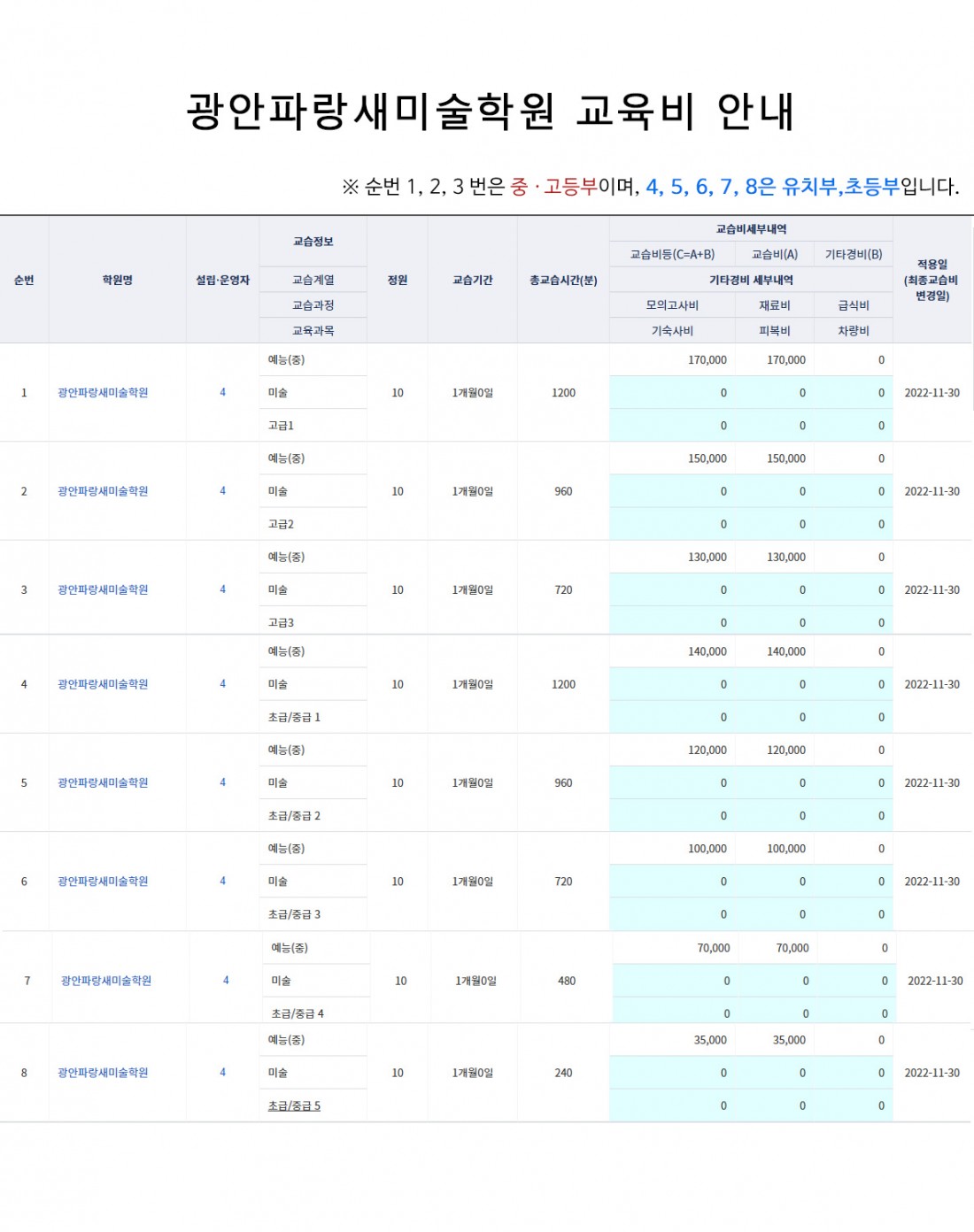 광안파랑새미술학원 교육비안내 페이지 정보 작성자 파랑새미술 작성일 24-11-11 21:33 조회 529회 댓글 0건 본문 . 이전글겨울 방학특강 후기 다음글키즈노트 설치안내 목록 댓글목록 0 댓글목록 등록된 댓글이 없습니다.